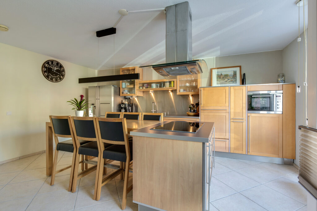 Begane grond: U betreedt de woning in de ruime lichte woonkeuken. De woonkeuken is v.v. een plavuizenvloer met vloerverwarming, trapopgang en trapkast. De nette keuken beschikt over een vaatwasmachine, inductiekookplaat, combimagnetron, afzuigkap en een Gröhe kokend waterkraan. Tussenhal met de meterkast, garderobenis, toiletruimte, bijkeuken met de wasmachine- en droger aansluiting en met toegang tot de berging. Tevens is er toegang tot de achterzijde van de woning, alwaar twee overdekte parkeerplaatsen zijn gesitueerd en een houten berging.