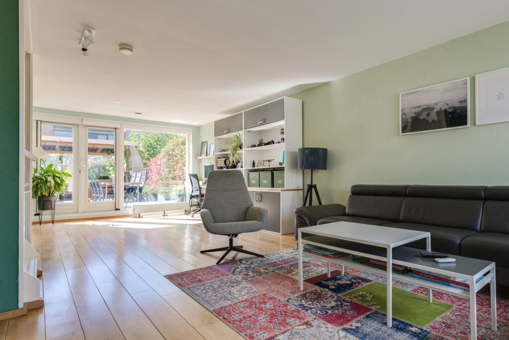 1e Verdieping: Direct valt de fijne lichtinval op! En wat een ruimte; de ruime woonkamer is voorzien van houten vloerdelen en grote raampartijen aan de voor- en achterzijde en een praktische bergkast met de C.V. (2021)- en WTW opstelling. Via de openslaande deuren bereikt u het grote dakterras, dat gunstig is gelegen op het zuidwesten en is voorzien van keramische tegels en een pergola.