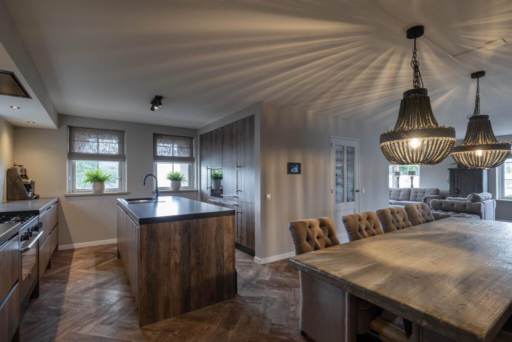 Begane grond: Hal/entree met de trapopgang. De lichte woonkamer heeft grote ramen waardoor je altijd rondom zicht hebt. Via fraaie schuifdeuren heeft u toegang tot de aparte TV kamer, welke is voorzien van openslaande deuren waardoor je zo de zonnige tuin instapt. De schitterende woonkeuken vormt het hart van de woning, waar je lekker kookt en borrelt met je vrienden en familie. Deze luxe keuken beschikt over diverse inbouwapparatuur te weten: 2x wijnklimaatkast, 5-pits gasfornuis met grote oven, Quooker, Miele combi stoomoven, 2 koelkasten, vriezer en een vaatwasser. Het geheel is afgewerkt met een fraaie PVC vloer met vloerverwarming. In de aangrenzende aanbouw is een praktische bijkeuken gerealiseerd en een modern toilet met apart urinoir. De master bedroom op de begane grond heeft een badkamer ensuite welke is voorzien van een wandcloset, wastafelmeubel en een comfortabele en zeer ruime inloopdouche.