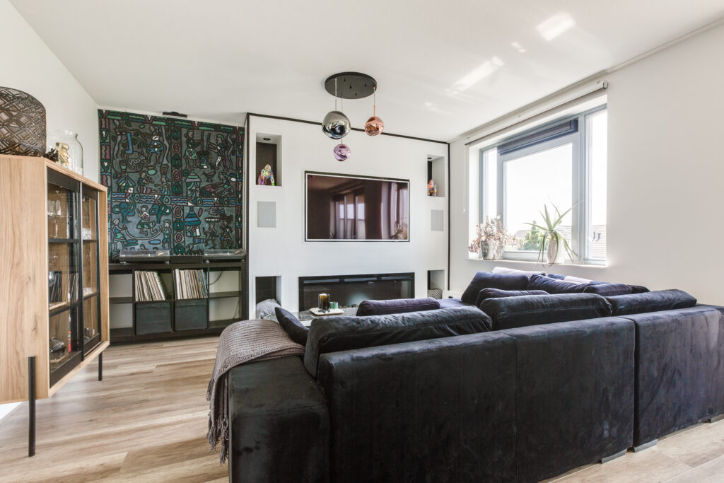 2e Verdieping: Hal/entree met meterkast, inpandige berging met de Cv-ketel, wasmachine- en drogeraansluiting. Woonkamer met een open keuken welke voorzien is van diverse inbouwapparatuur te weten; gaskookplaat, combimagnetron, vaatwasser en een koelkast met vriesvak. Via de woonkamer, welke is voorzien van een cinemawall met geluidsysteem en elektrische haard, is er toegang tot het ruime balkon afm. (ca. 193 x 400 cm.) welke gelegen is op het zuidoosten. Twee keurig afgewerkte slaapkamers van ca. (350 x 296 cm.) en (300 x 277 cm.). Moderne badkamer (2021) welke volledig is betegeld met een ruime inloopdouche en dubbele wastafel. In de gang bevindt zich tevens het toilet voorzien van een hangend wandcloset met fontein.